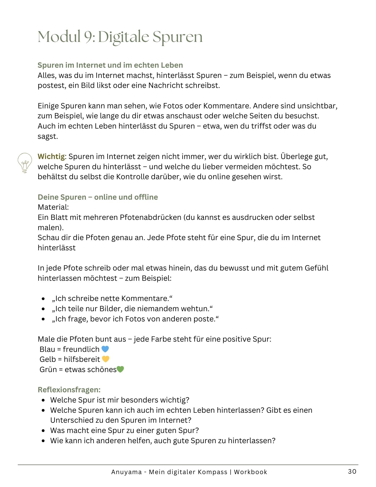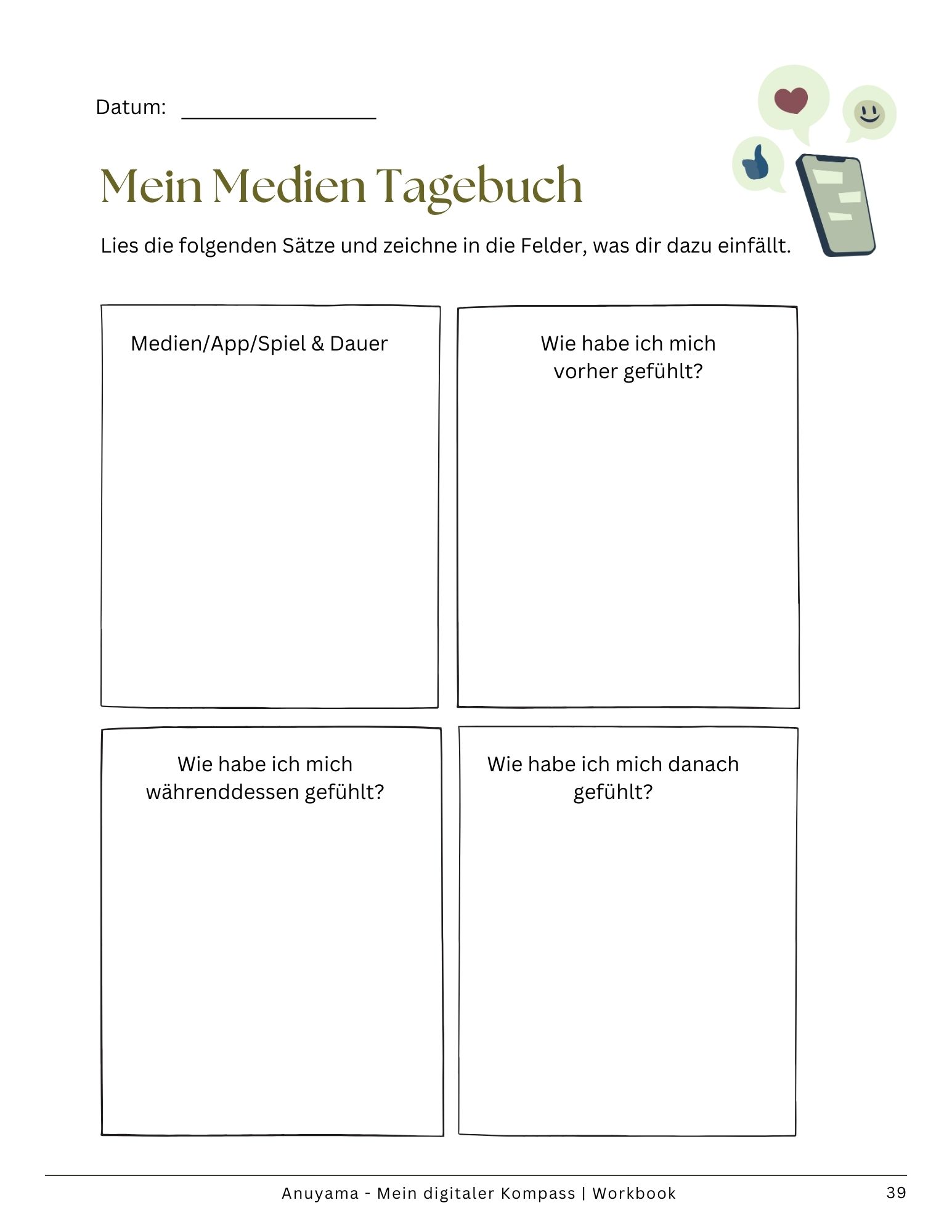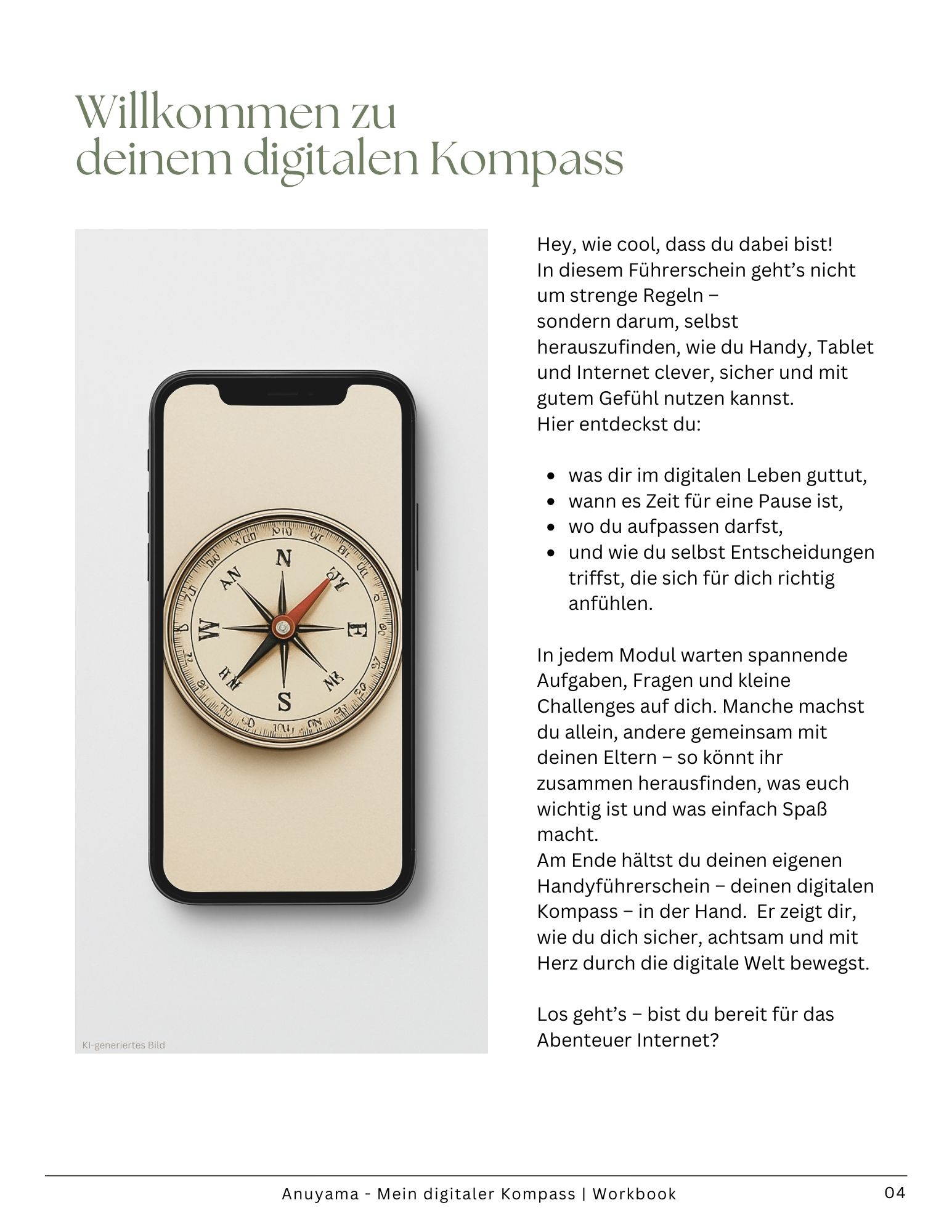 Der „Mein digitaler Kompass“ begleitet Kinder und Eltern liebevoll durch alle wichtigen Medienthemen. Mit kindgerechten Übungen, Achtsamkeitsimpulsen und klaren Erklärungen lernen Kinder, sich sicher und selbstbestimmt online zu bewegen. Für ein entspanntes, kompetentes und bewusstes Aufwachsen in einer digitalen Welt.